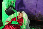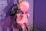 She fills a tray and sits in it, pours gunge all over her ouitfit, fills her pockets, and pours lots of gunge all over her hair and face to finish with.