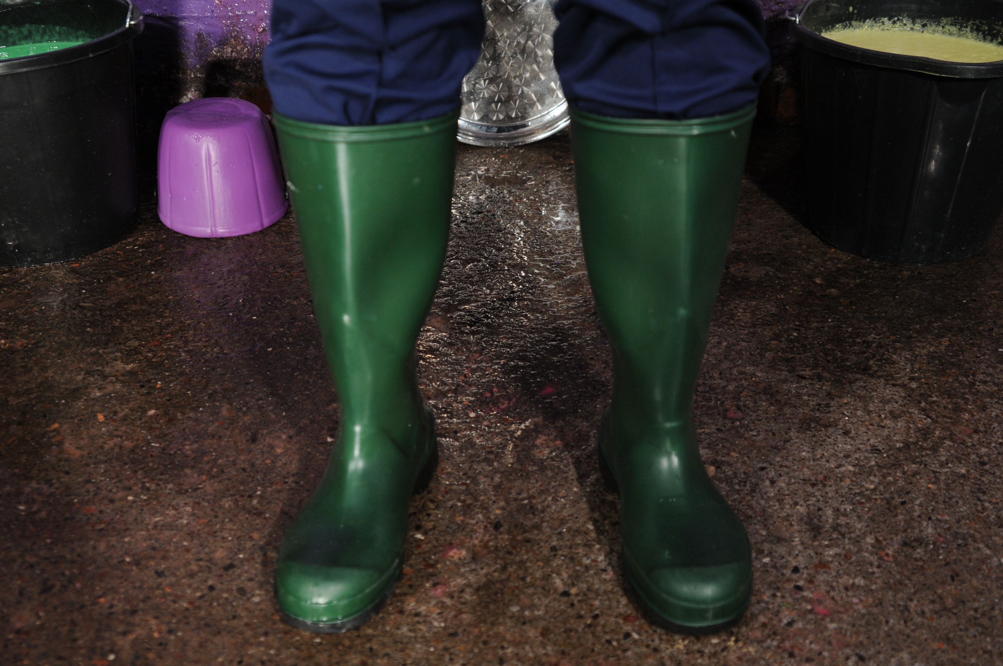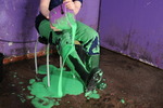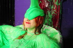 Dressed in a smart dark blue modern veterinary nurses uniform, with green wellies on her feed, redhead Rosemary gives herself a very thorough green gunging, utterly drenching her uniform and herself in goo.