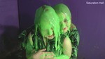 Rosemary gives Felicity a very thorough punishment gunging in green, filling and completely messing up her catsuit and boots. Of course this being Saturation Hall, where the ancient laws demand fair and equal treatment of all, once she's finished messing up Felicity, Rosemary reclines in the dungeon bath and instructs Felicity to completely cover her in more buckets of bright green gunge.