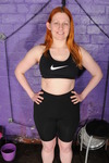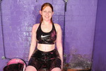 Dressed in just tight lycra running/cycling shorts and a Nike sports-bra top, and with no underwear, Rosemary first goes through a series of exercises designed to really show off her rather sexy workout clothes, and then she adds bright pink gunge to her routine. Feeling that her shorts are alltogether too dry against her skin, she pours pink gunge down inside he front, sighing with pleasure as the gloop flows down between her skin and the lycra. Loving the feelings as the wetness spreads, she wastes no time in pouring lots more gunge in while continuing to bend and stretch, and soon her shorts are utterly drenched in bright pink slime.