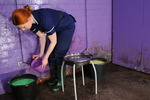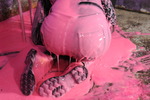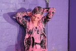 Her bra-top gets the treatment next, and it too is drenched in gunge. Her bare feet get the full treatment, and then it's the turn of her long red hair to be completely drenched in pink goo, and she pours it all over her face too. By the end of the routine she is utterly drenched in gunge from head to toe.