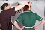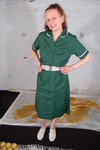 Watch Lady Amaranth of the Southlands, dressed in a bottle green nurses uniform dress, white elestic nurses belt, and white deck shoes, having her dress well filled and then completely covered in custard, all at Chastity's hands.