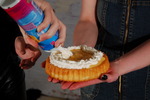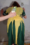 Once the filling is done, it's time to start pouring custard all over the front of the lady's dress, then down the back and over her bottom, and finally finishing off her sleeves and any remaining clean areas. Cola follows custard, four big 2 litre bottles in total, one each inside and outside, down the front and down the back.