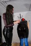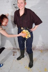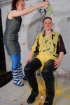 In these enlightened times of course women of all classes wear jeans, and the ladies of Saturation Hall regularly get gunged in them too! Which brings us to Modesty, dressed in black strappy swimsuit over black bra, and blue jeans tucked into her leather explorer boots (to catch the drips), about to get a propper egging and beaning at the skilled hands of Prudence the Housekeeper, suitably dressed for the task in the modern Hall servants' uniform. Don't worry, Prudence has her own beaning and egging coming up soon enough!