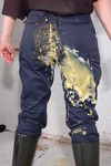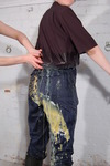 Her trousers are now wet but not so messy inside, so now she has the waistband of her trousers pulled out, allowing all the mixed mess trapped round her waist to drop down into her wet trouser legs. After that it's pie-sitting time, and squelch! - down she goes into a nice gooey concoction.