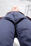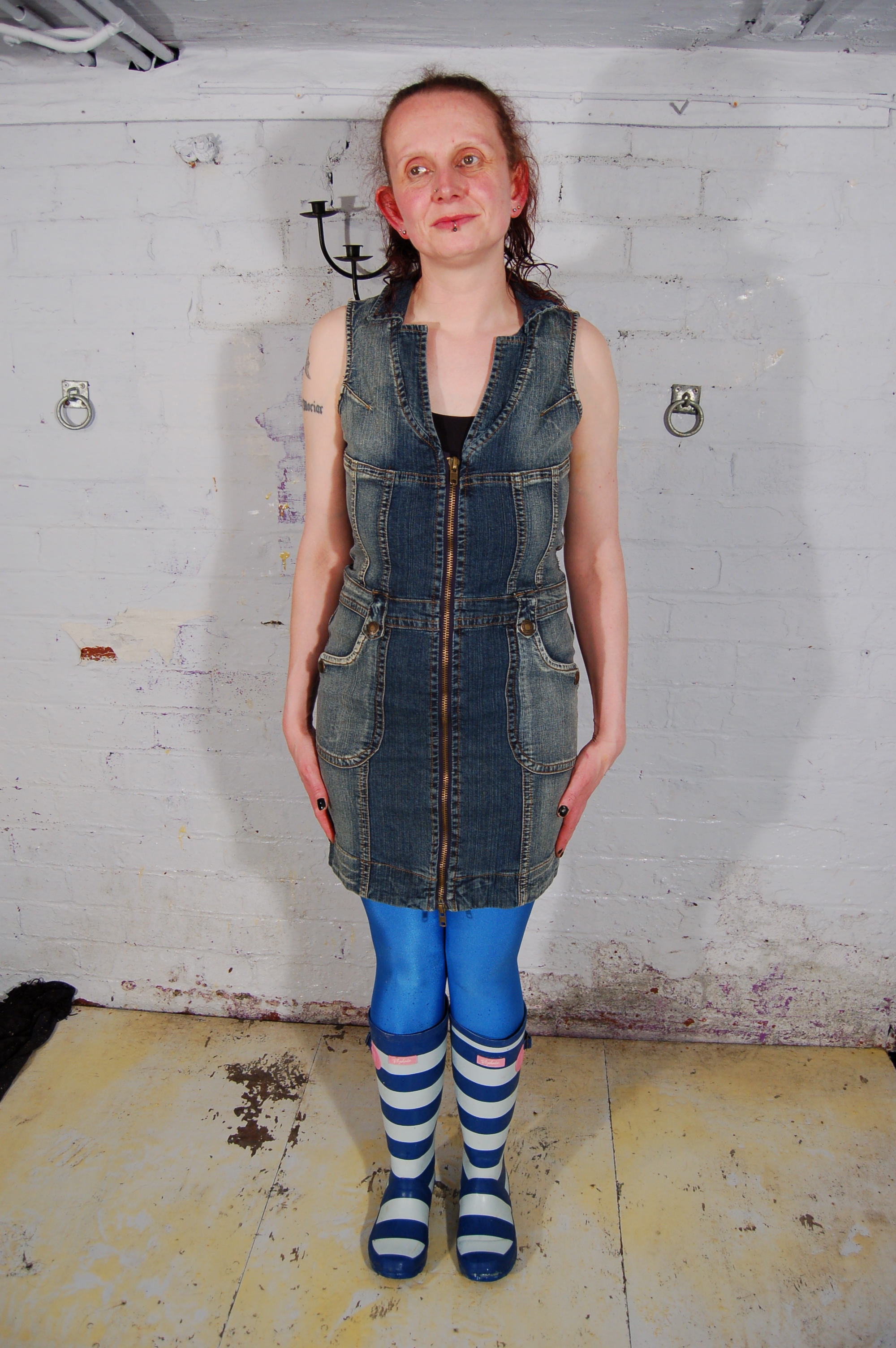 She dresses in a simple artist style, wearing a pinstriped grey and dark blue artists smock, belted at the waist with an elastic nurses belt in dark blue, over shiny black leggings and lace-up black plimsolls, and using the dungeon as her studio, she sets about herself with enthusiasm.