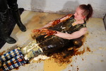 She likes custard too, and soon fills one of her back pockets with thick yellow gunge. And then she sets about herself with treacle and syrup, and very quickly her once-clean suit is drenched as she pours more and more gunge down her front while sitting on the dungeon stool, allowing the mixed mess to flow down over her legs and trunk.