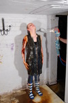 Afterwards, Lady-A is hosed down, first while still weariing her gunge-filled and soaked dress, after a while under the hose she takes the dress off and finishes the hosedown in just her leggings, swimsuit, and boots.