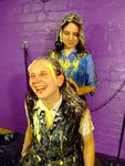 Once their clothes are pretty well covered, the ladies take turns to sandwich each other's heads with custard pies, and drench each other's lovely hair in custard, shampooing it in thoroughly.