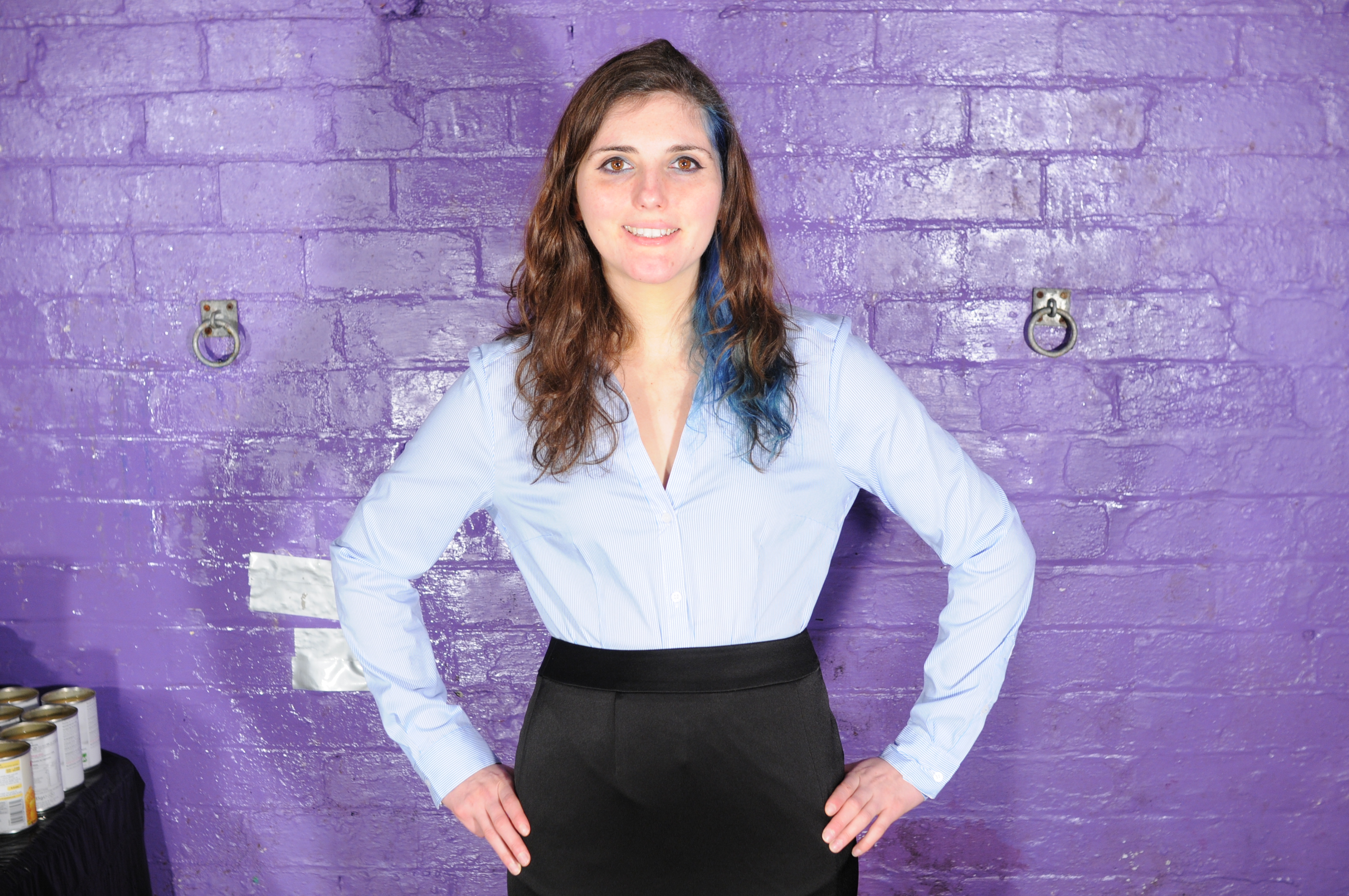 Today Maude is testing a potential new managers uniform. She is wearingt a floor length black pencil skirt, with a split to the knee on the front left, black tights, very smart black leather lace-up heeled shoes, and a long sleeved blue and white pinstriped blouse with an open neckline. This would of course be a "dress" unifiorm for office use, and looks very smart and even a little sexy, but like any clothing selected for staff wear on this estate, it must also give good performance when soaking wet and covered in mess. So Maude is going to put it to the test for us.
