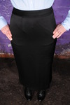 Next, how will that beautiful long satin finish penil skirt handle the mess? Several cans of soup get poured in down the front, flowing inside the skirt and covering Maude's tights, visible through the skirt's long slit. Custard follows, just to really ramp up the test.