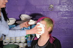 Eventually she is completely drenched in custard - and so she gets thoroughly hosed down too!