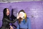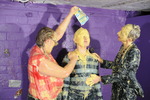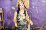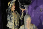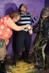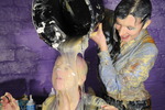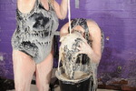 Using paper bowls variously filled with custard, squirty cream, and occasionally even rice pudding, they repeately splat each other in the face, over their hair, and pie sandwiches. Honeysuckle also has slices of gateaux mashed into her lovely long black hair, and as well as many pies, they also have two full buckets of transparent clear gunge, some of which gets used in pieings and the rest of which they pour over each other.