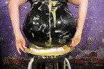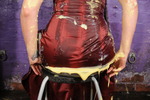 But the fun doesn't stop there. Once she has completely wrecked her dress and boots, inside and out, with custard and soup, she then picks up a completely clean bright red pvc raincoat, and pulls that on over her mess-drenched dress, covering the inside of the coat in gloop as she does so and pulling it tight on her body to make sure it gets thoroughly messed up inside too. The contrast of the clean scarlet pvc of the coat and the mess-drenched leatherlook dress underneath it is quite something. And then Maude drenches the outside of the coat in mess too, but not before playing with it in various stages of messiness.
