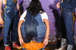 She starts with some nice clothes filling, both front pockets get filled, and then several cartons of custard go in down the front of her jeans, filling them quite comprehensively as she enjoys the feeling of custard flowing around her trunk and down her legs, inside her jeans.