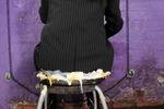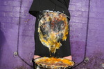 Next, she fills a silver tray with custard, and then carefully sits down in it, coating the seat of the trousers and dipping the edge of the tunic in thick yellow fluid.