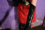 So now the time has come for Honeysuckle to pay for her misdeed. She's in the dungeon, dressed in exactly the same outfit she wore that night, black skirt and blouse over black underwear, with leather knee boots on. And he's sitting on a chair with her feet in an empty tub, and about to get totally deluged with lashings of savoury mess by Friday.
