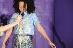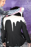 Meanwhile Friday wears black tracksuit trousers over a Slazenger swimsuit, with a black and pink running jacket. This being Saturation Hall both girls wear sparkly wellies to finish off their outfits, and hopefully contain any gunge that runs down inside their trousers so no-one loses the challenge too quickly.Each girl can chose where each pot of Dream is poured in or on her outfit, so needless to say there's lots of clothes filling as they try and get as much as they can inside their clothes without any dripping off. Friday has mess poured into her blouse, down her trousers front and back, and into her suit jacket pockets, including the ones inside the jacket in the lining. Felicity has the cream poured inside her swimsuit, down her trousers, and into the pockets of her running jacket.