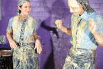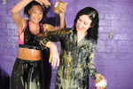 Two very up for it girls, in lovely casual outfits, getting totally drenched in mess together!