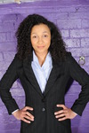Friday wears a very smart pinstripe business trouser suit, jacket and trousers, with a lovely pale blue blouse.