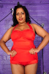 Teena wears a delightful reto-50s one piece swimsuit, with a cute little modesty skirt at the front, which she's more than happy to flip up on occasion so we can see what is happening to the suit crotch behind it. It will be interesting to see how this suit ehaves when drenched in goo.