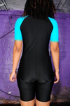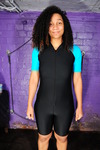 Friday wears a black and turquoise, high collar, short sleeve surfing suit, with a concealed front zip and just-above-the-knee legs. Designed for riding surfboard under the blazing sun, spandex suits like these are close fitting, lightweight, and easy to move in, while protecting the board rider from dangerous solar UV. Not much UV in our dungeons, but plenty of custard to be poured in. She wears an ordinary one piece swimsuit under the surf suit, this is seen, already soakesd in mess, briefly when she unzips the front of her suit a ltllte near the end of the scene.