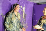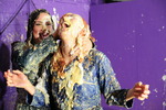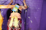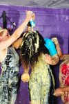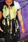 Tomato soup, custard, spaghetti hoops, baked beans - they use it all on each other. Teena has her dress filled, covered, and at one point has one of her boots unzipped, filled with spaghetti hoops and zipped back up again. Friday has various messes pouured into her skirt, front and back, down her top, again front and back, and both women end up totally covered and drenched in mess. Both have their hair well gunged and faces covered at the end too.