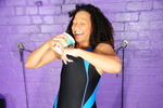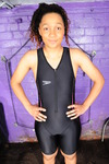 One for the spandex and skin-tight and swinsuit fans, watch as Friday, dressed in an NSA competion legsuit swimsuit, in black with blue highlights, completely fills and covers her suit with cream, custard, and tomato soup!