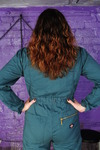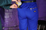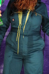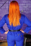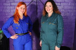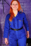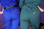 Rosemary wears a smart royal blue boilersuit with a black belt to pull it in at the waist, Rosemary wears a beautifully fitting green suit, both are by Dickies workwear. Rosemary teams hers with 3" heeled New Rock boots, while Maria wears transparent ankle boots and rolls her suit's trouser-legs up a little.