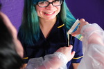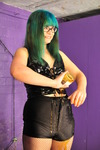 Turquoise-haired Daisy covers her denim outfit with custard and cream