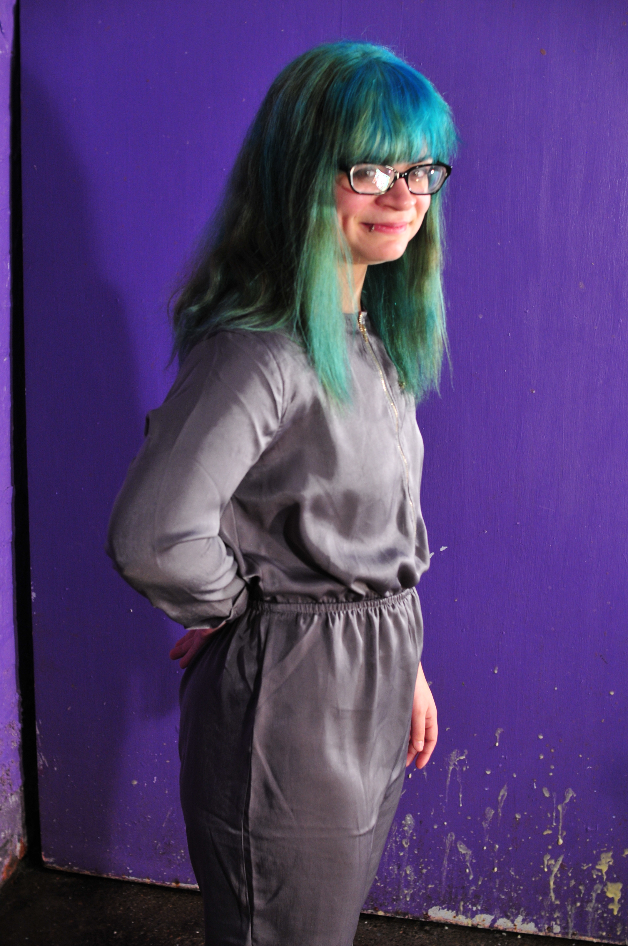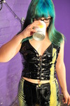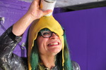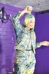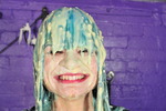 Eventually, she takes the by now very messy clear PVC suit off, and finishes off her silky silver jumpsuit before giving her bright green hair a very thorough honey and custard shampoo, including pouring custard and honey down her face and through her glasses.