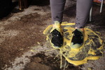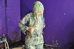 The suits have quite tight elasticated waistbands, so initially the mess gathers at the two willing victims' waists - but then the waistbands are pulled out, and down it all floods!