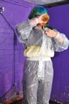 Something a little bit different: Evelyne the Cook, and Virginia, are both dressed in see-through OMP plastic jumpsuits, worn over simple black trousers and tops, and with wellies on their feet, while Daisy is in a dark blue nurses uniform dress, with matching dark blue wellies. Daisy is going to fill the other two's suits with mixed sweet mess - syrup, custard, and Devon Dream - and we'll get to watch the gloop flowing down inside the see-through suits while enjoying the gasps and reactions as the cold gloop slithers down.