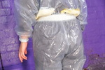 As she pours the gunge in we get to watch through the crystal clear plastic as it pools and collects at the tight waistband, slowly spreading out round her waist till it flows all the way round her back, but the tight elastication of the waterproof suit stops any leaking down to her legs. She sits down and pours more gunge in down the back of her neck, now some does leak down at her bottom and starts to flow down the backs of her legs, but the front still holds firm even as she pours even more goo in.