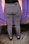 Virginia wears grey women's running trousers with pink flashes and a thin black loose sports top, no socks, and black plimsolls. Daisy is wearing a black one-piece swimsuit with pink detailing, and black shiny wellies.
