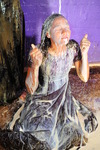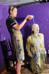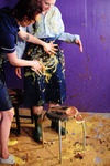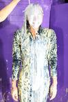 Friday comes to rest with the underside and both sides of the dress submerged, just the front still clean and pristibe. And then Evelyne brings over a fresh gallon bottle of syrup, and starts pouring it all over the remaining clean areas of the dress, while Friday plunges her arms into the thick, rich liquid and enjoys creating flows and films between her arms.