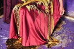 Needless to say a dress as beautiful as that isn't going to stay clean for long round here, and look, here is a traditional tin bath, well filled with several gallons of thick, gloopy golden syrup. Evelyn the cook, in a spotless black boilersuit, steadies the bath, and slowly Friday lowers herself back into it, first the trailing lace streamers just rest on the surface, surely she could stop here, stand back up, save the dress from its fate... Nope! In she goes, her shapely satin-clad bottom pressing down on the surface and then the dress sinking into the syrup even as the level rises, as Friday sits all the way back and immerses herself in the syrup bath.