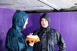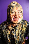 And then the messing begins! Veronica takes a pie to the face to start, the a pie sandwitch, and then lots of custard poured all over her clothes. Meanwhile Eliza, who is initially testing the effects of gunge poured inside her waterproofs, is treated to a very thorough clothes filling, down the front of her trousers, down the back, her hood filled and then raised and splashed onto her head, and her jacket, done up again after being opened for the trouser fillings, filled too.