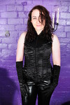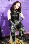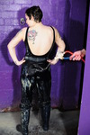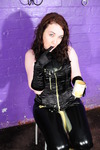 Chastity is dressed for clubbing, black PVC jeans, New Rock boots, and a little black PVC lace-up sleeveless top.