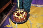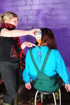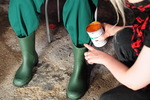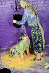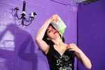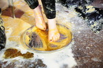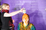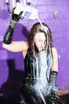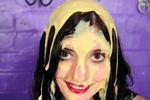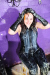 Custard down her corset come first, then more down the inside of her PVC suit. Her boots get carefull treatment to ensure they are drenched in gloop, and her hair gets a milk-and-golden-syrup shampoo.