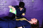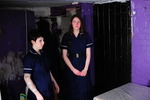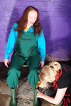Chastity wears a dark blue nurses uniform dress, belt, and wellies. Kitty wears a dark blue nurses uniform tunic and matching trousers, and matching blue wellies.
