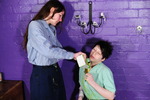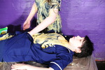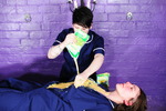 Two willing women in smart blue medical uniforms, and lots and lots of custard - the perfect prognosis for seriously messy treatment.