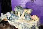 Chastity is first to receive the treatment, lying face-up on the table she has her dress opened and custard poured on a spread all over the swimsuit she's wearing under it, her dress is neatly done back up and then her skirt is lifted and the crotch of her swimsuit plus her bare legs and inside of the back of her dress are completely coated, then the front of her dress is covered, and finally she rolls over and has the back of her dress drenched in yellow too.