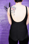 Kitty is dressed for the dance studio, black spandex leotard over black spandex leggings, and with plimsolls on her feet.