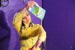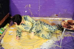 Very slowly, little by little, her ladyship gradually fills and covers every inch of her outfit and herself in thick yellow fluid. Pockets are filled, floor pools are sat in, full buckets of custard are played with and eventually poured over the costume, she even shampoos her hair in the bucket of custard.