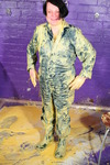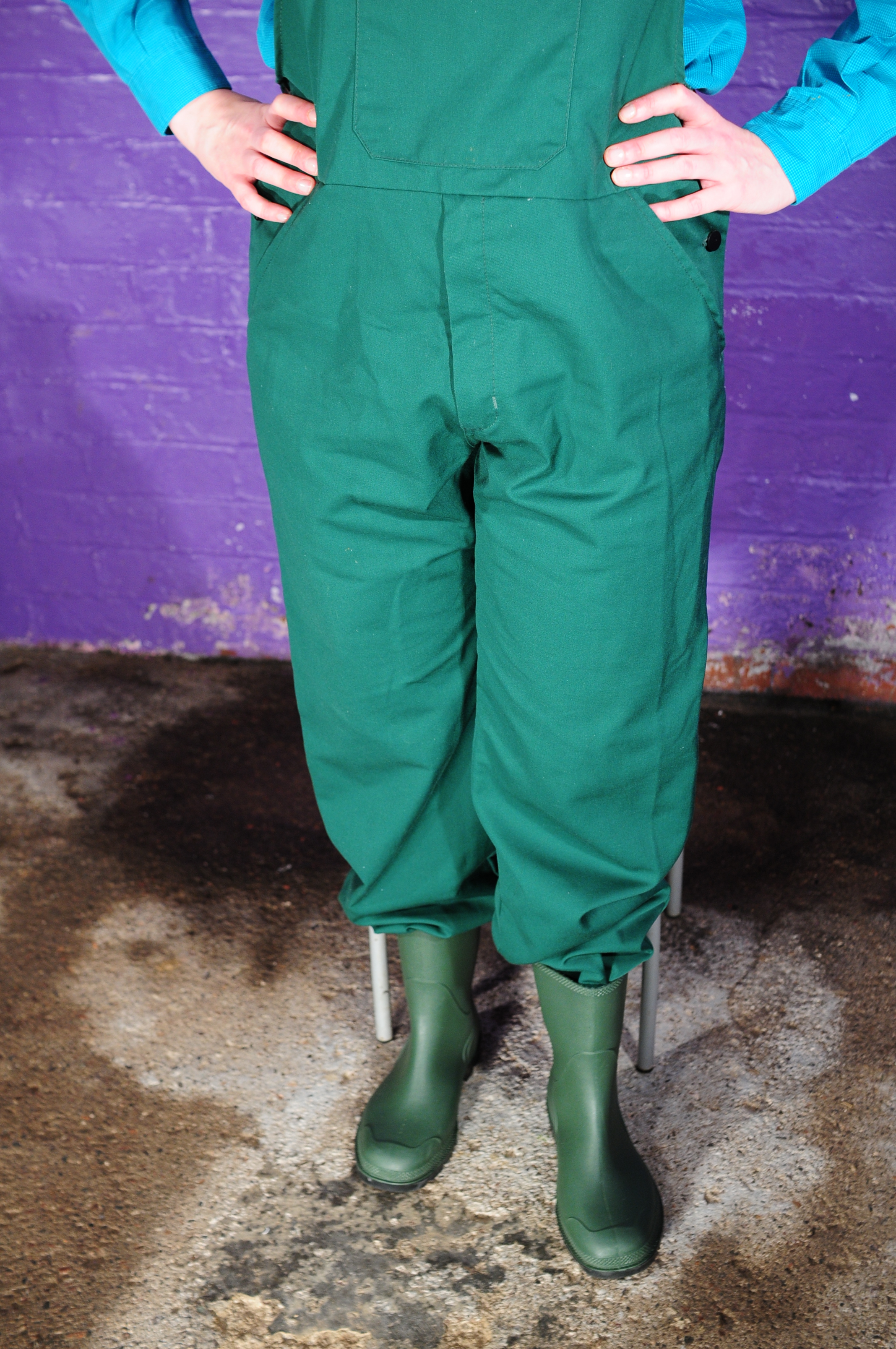 The outfit is by Alexandra, taken directly from one of their catalogue photographs, and comprises a womens workwear engineering jacket, womens workwear combat trousers, both in royal blue polycotton, and a pale blue polo shirt. A solid white belt and big black rubber boots complete the ensemble.