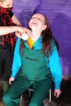 How much mess can we fit into Lady Amaranth's green dungarees and uniform shirt? This is the kind of question we like to answer here, and so Lady-A willingly volunteers for a spectacular savoury sliming, at Felicity's hands. She starts with beans. Lots and lots of beans, can after can tipped into the bib of her ladyship's green overalls. After a few pours, damp stains start to show between her legs as the bean sauce starts to soak through the fabric, but Felicity doesn't think it's really happening fast enough, so in go the cans of tomato soup to help spread the wetness!