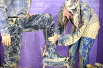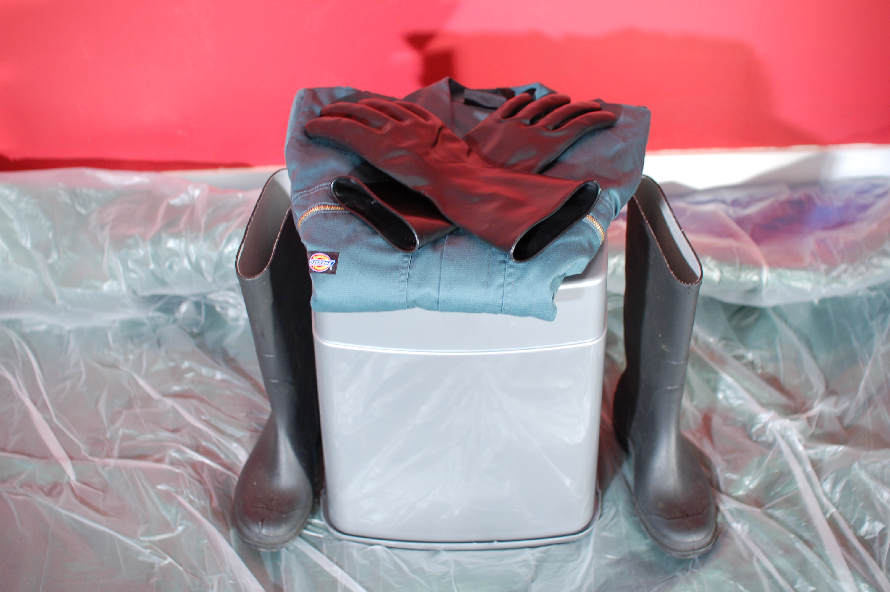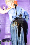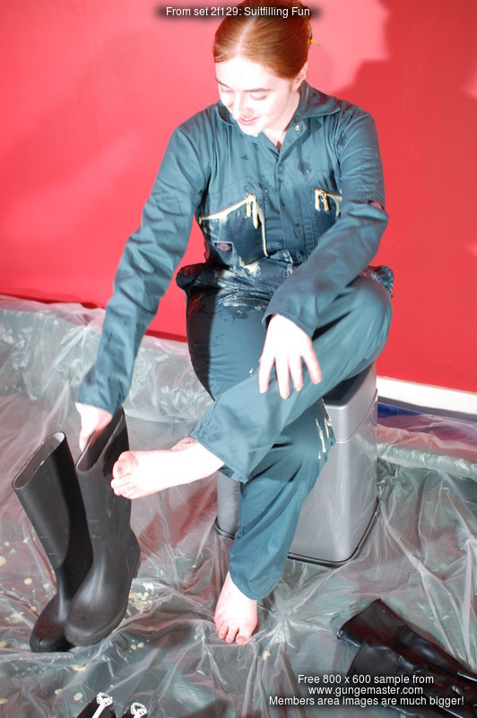 She continues, carefully and with great attention to detail, covering her entire suit in custard. As well as the custard filled wellies, she also puts on custard filled black rubber gauntlets, and all the while continuing to spread and massage custard all over her boilersuit.