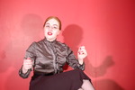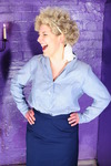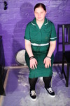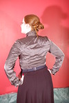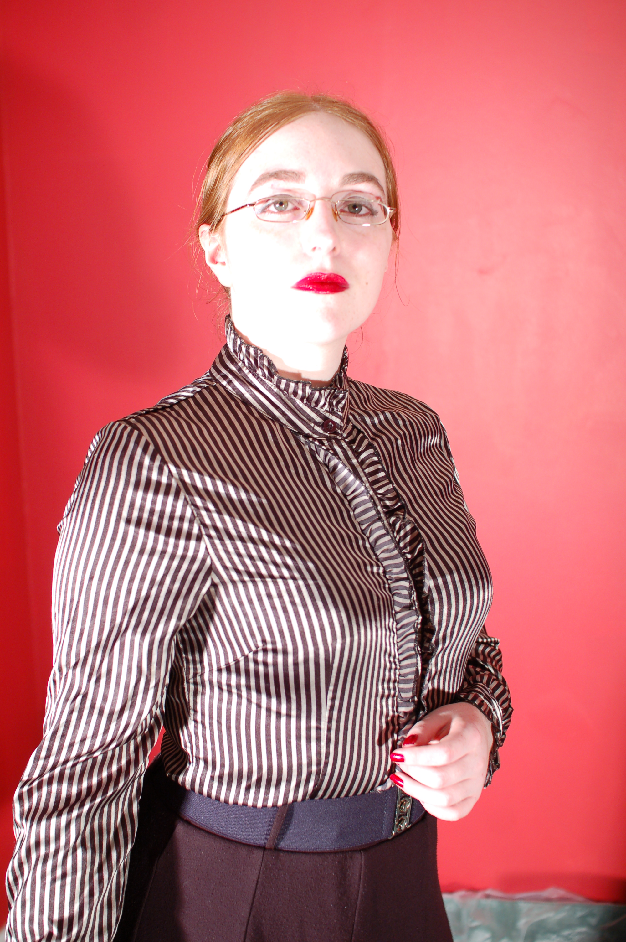 Dressed to the office nines in a high-collared grey striped satin blouse, black office skirt, stockings with suspender belt, and high heeled shoes, and finished off with her stern glasses and bright red lipstick, Sister Graves looks every inch the strict office boss.