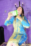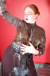 Chastity in PVC has custard thrown all over herself